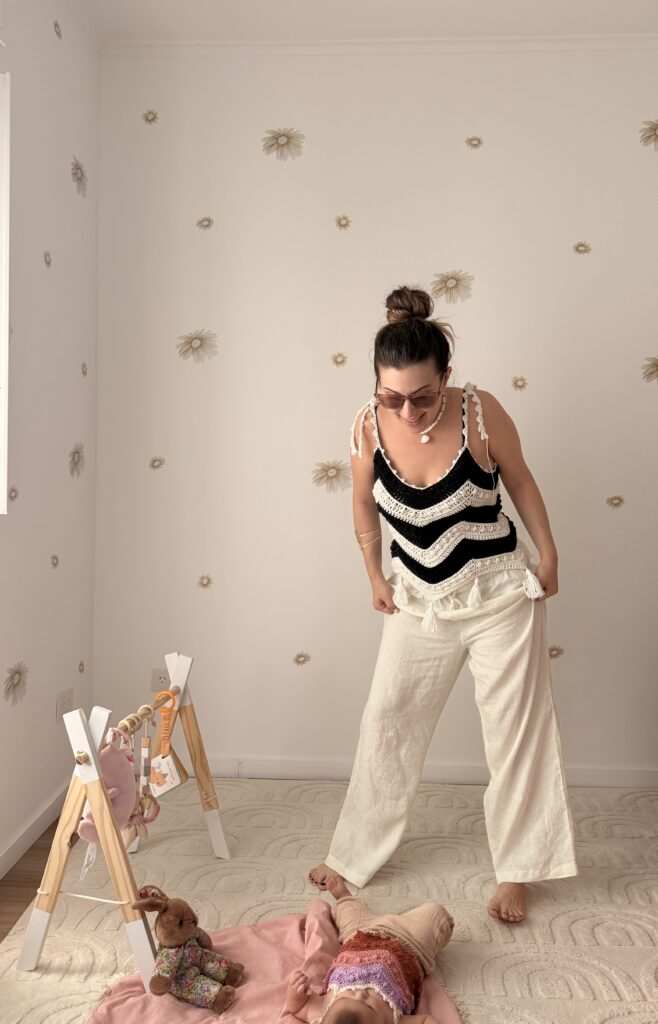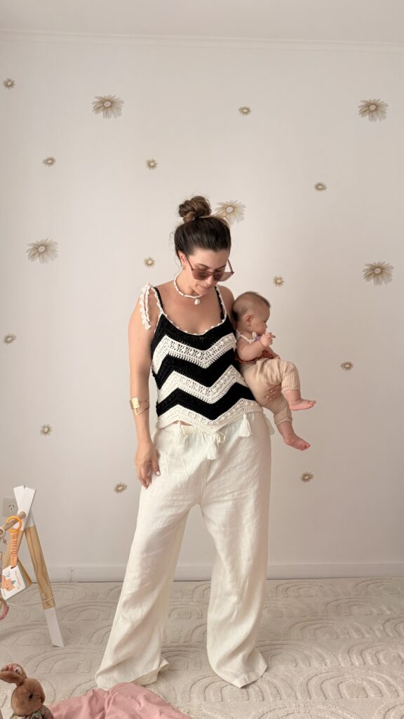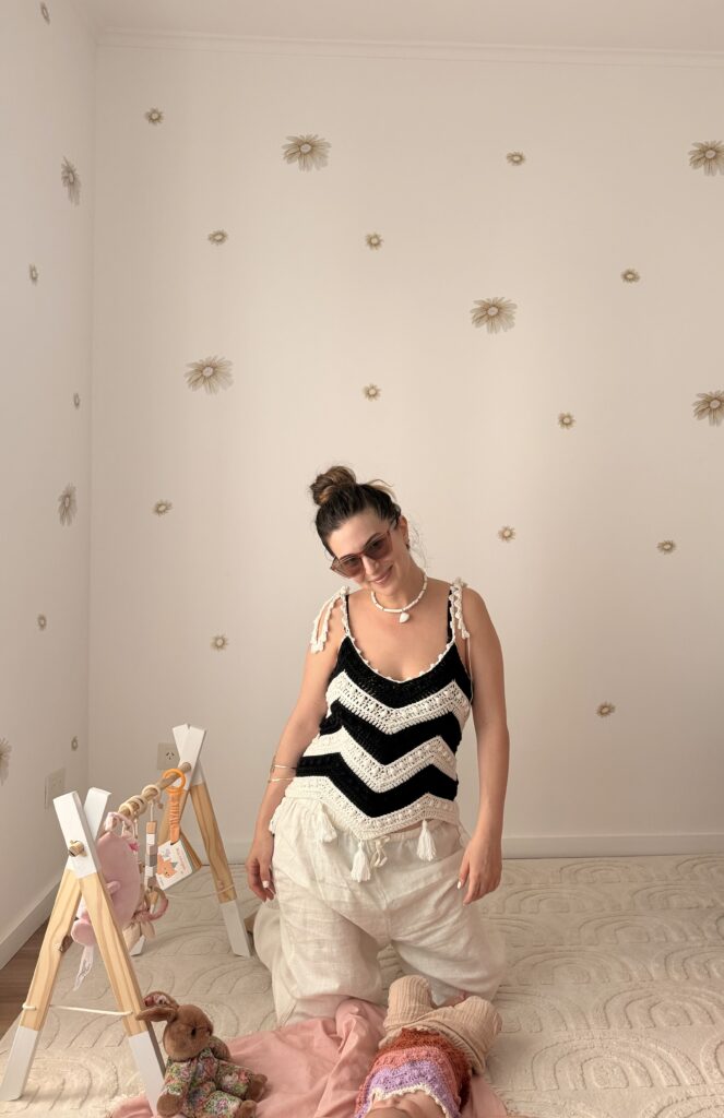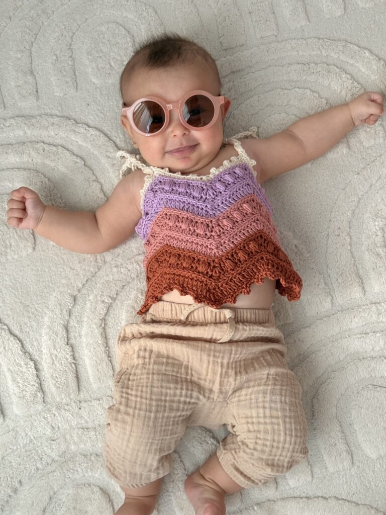 ♥ Este diseño nació en plena maternidad, tejido de a ratitos, entre pausas y tiempos reales. Aun así, tejí TRES musculosas en menos de un mes, probando combinaciones de colores que motivaban a seguir fila tras fila.